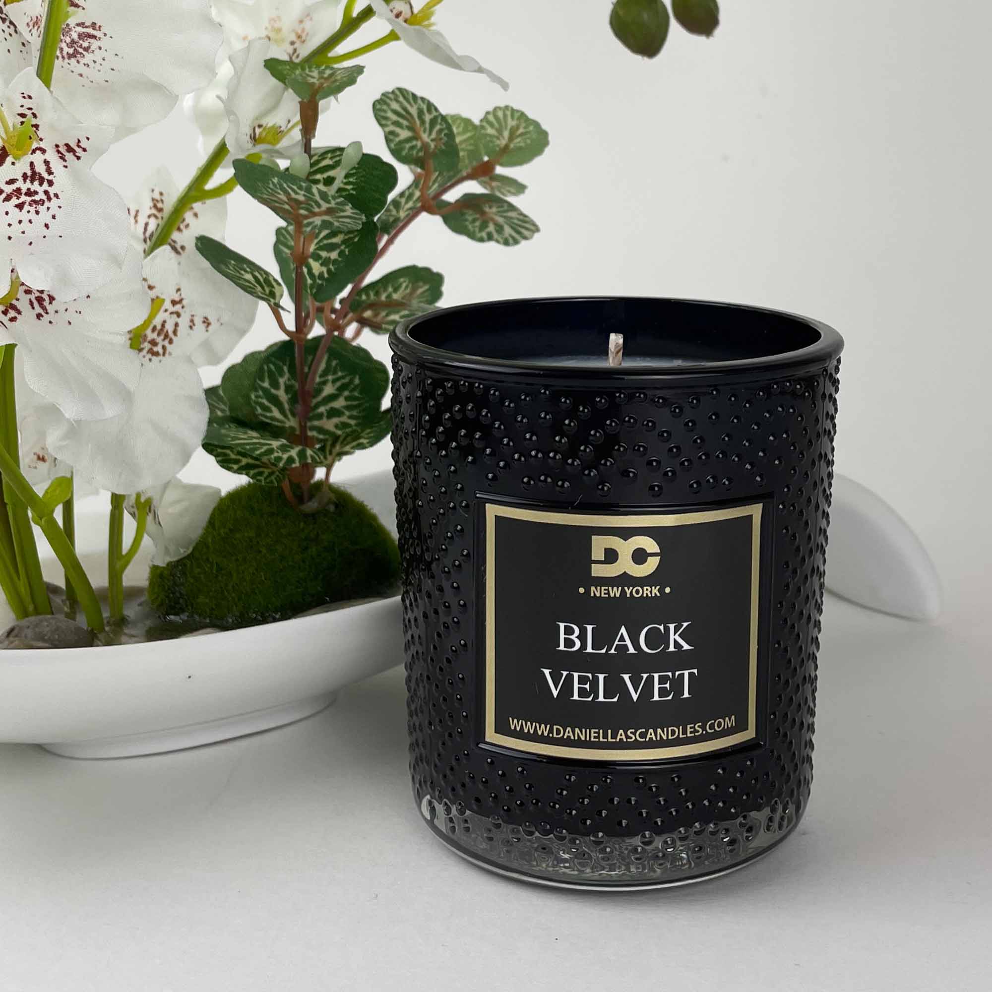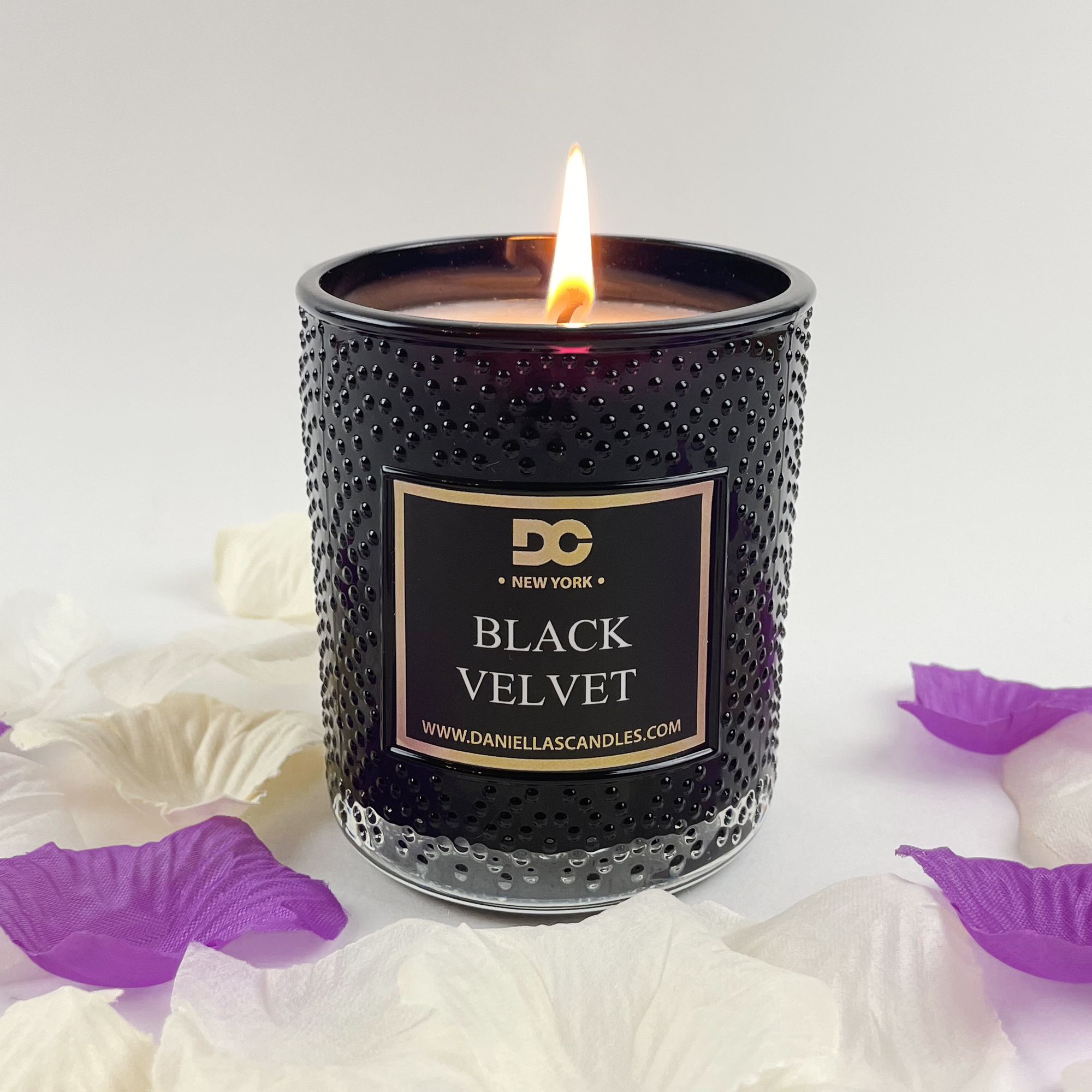 BLACK VELVET Candle: This cosmopolitan scent begins with top notes of Sicilian lemon, bergamot, and French lavender leading to middle notes of Tonka bean, rich Madagascar vanilla and sultry Amber Noir. These top and middle notes are anchored by a base of smoky Indonesian Sandalwood, incense, and white musk.