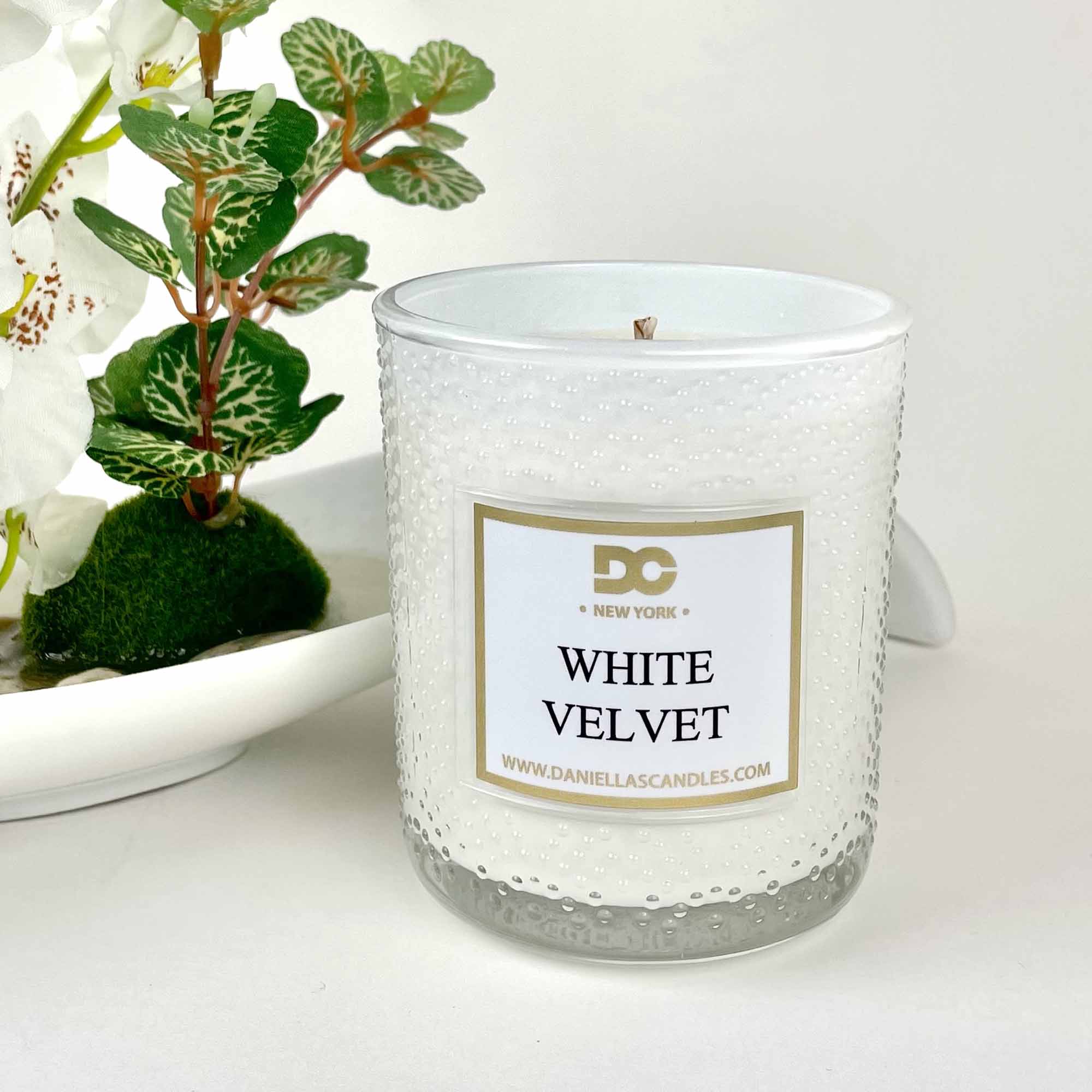 WHITE VELVET Candle: If Audrey Hepburn could be a perfume, this is what she'd be. Playful, airy, a bit sweet, a bit floral. This delicately feminine scent flirts with an open of perfumed Jasmine air, white poppy, and sheer yuzu zest and then dances with sheer abandon amongst white poinsettias and snowdrop flowers, before coming to rest among the powdery finish of frosted, silver, and white velvet musks.